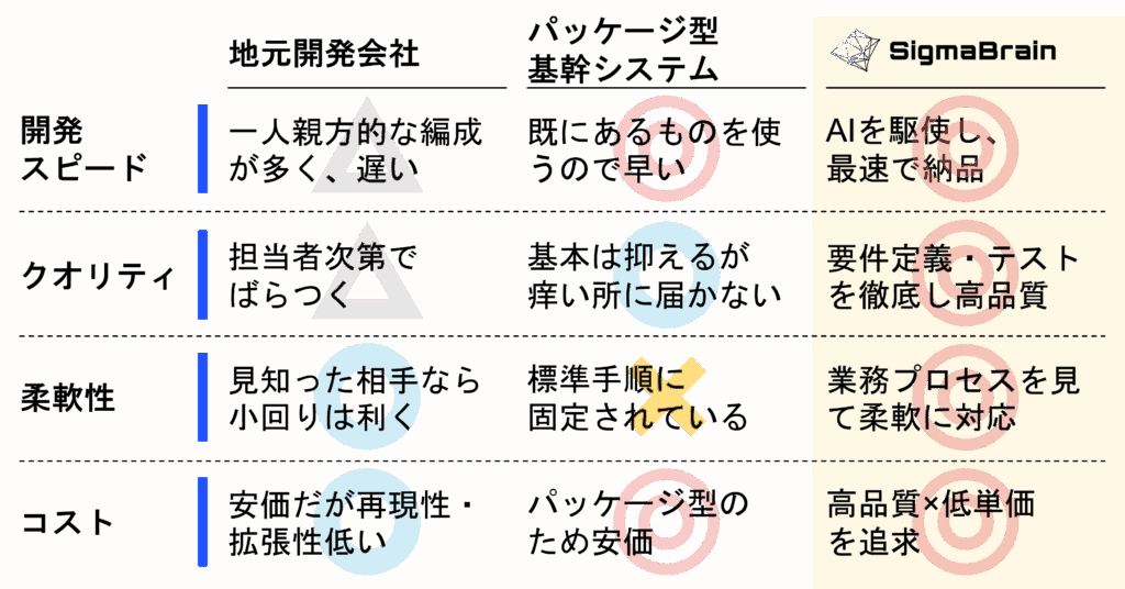 だから、SigmaBrainは開発をAIに任せます。代わりにスタッフが貴社の事務所、工場、現場、どこへでも足を運び、業務の実態を生で見て、現場スタッフの声を聞き、貴社の困りごとに一緒に寄り添い頭を悩ませます。そうして時間をかけることで、最高のシステムができあがりあます。
